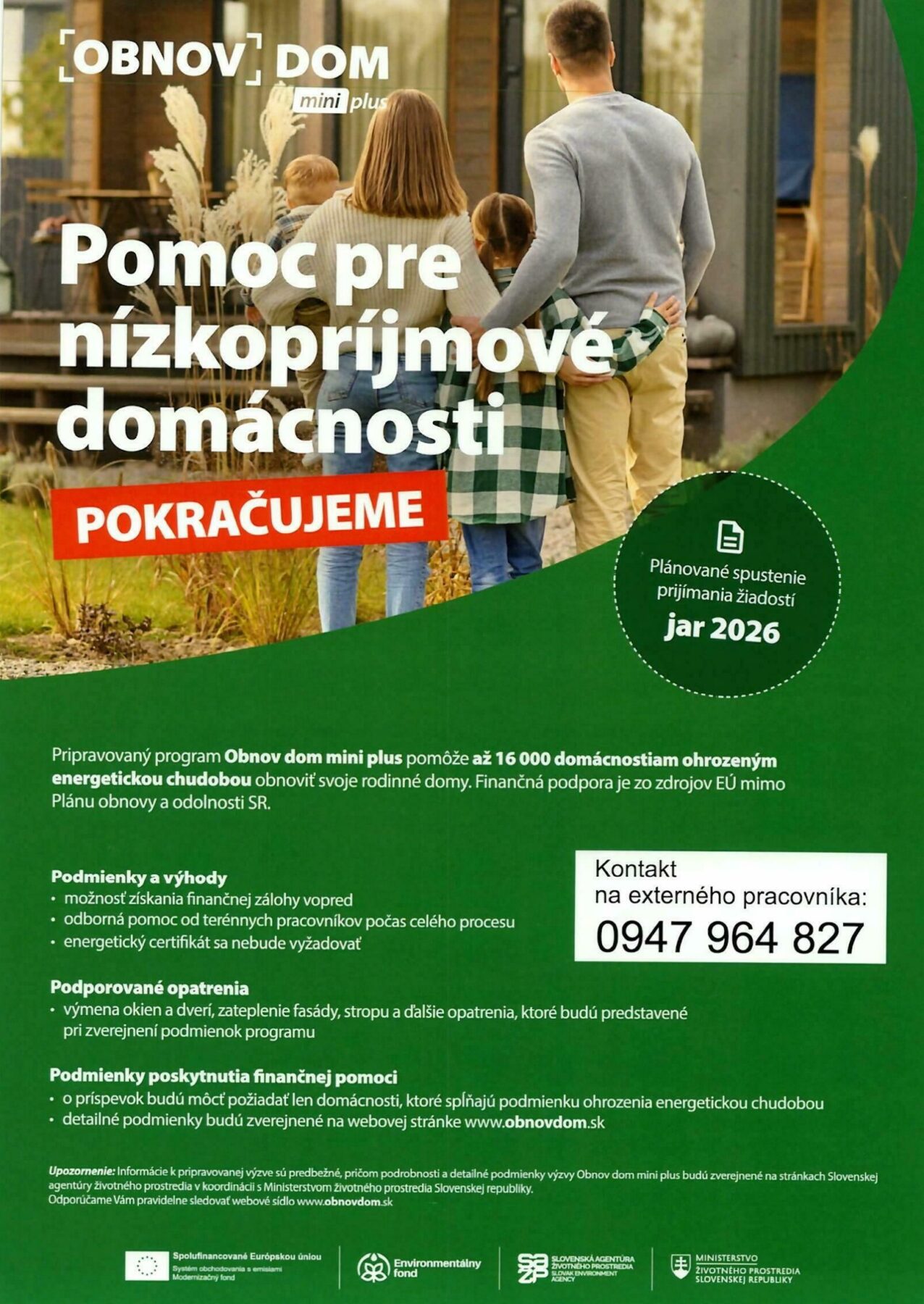 Pripravovaný program Obnov dom mini plus pomôže až 16 000 domácnostiam ohrozeným energetickou chudobou obnoviť svoje rodinné domy. Finančná podpora je zo zdrojov EÚ mimo Plánu obnovy a odolnosti SR.