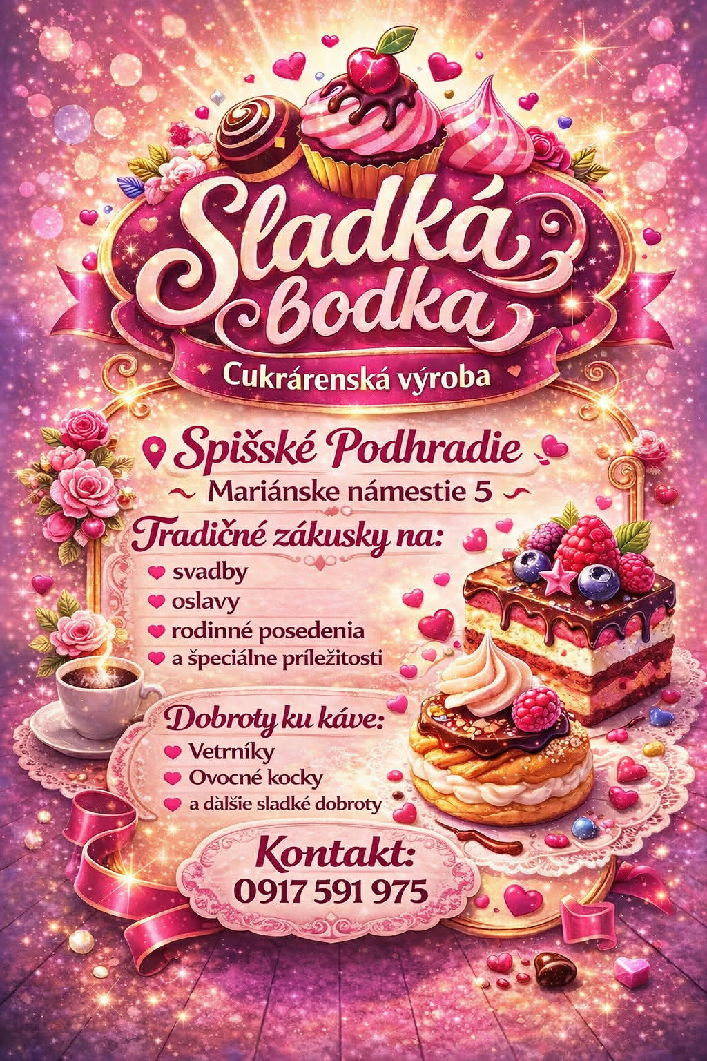 Navštívte našu cukrárenskú výrobu v Spišskom Podhradí ( Mariánske námestie 5)a doprajte si poctivé domáce zákusky, ktoré chutia ako od babičky – otvárame 16.03.2026
